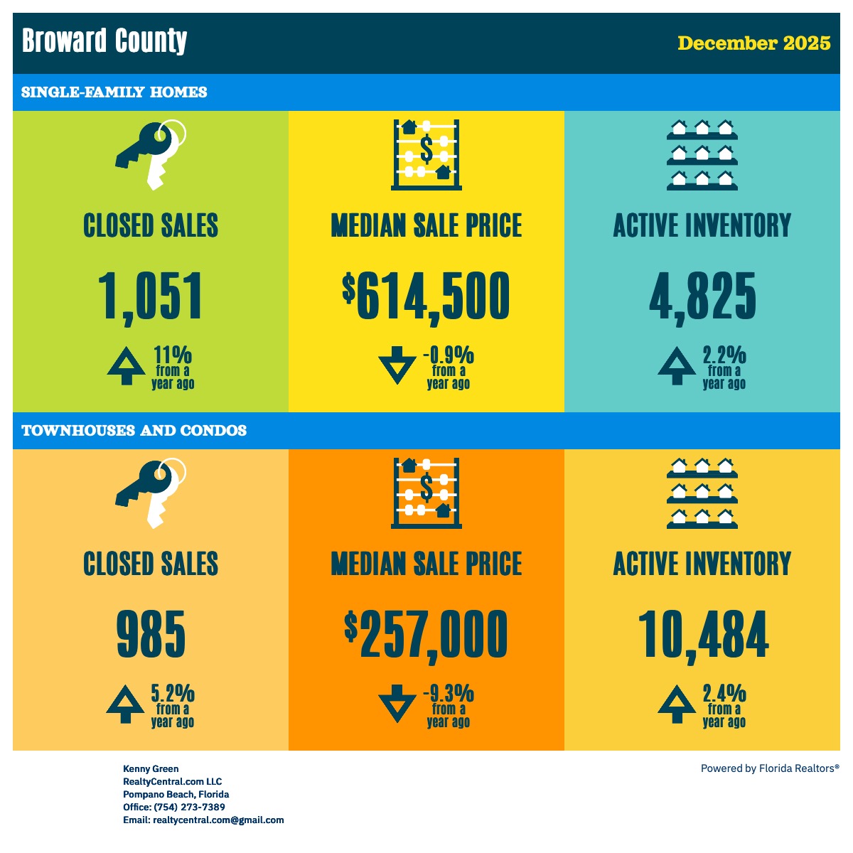 Real Estate Inventory for December 2025 in Broward County is up 2.2% year over year for Single Family and up 2.4% year over year for Townhouse/Condos with Median Sale Prices decreasing by 0.9% to $614,500 for Single Family and decreasing by 9.3% to $257,000 for Townhouse/Condo Sales for the same period.