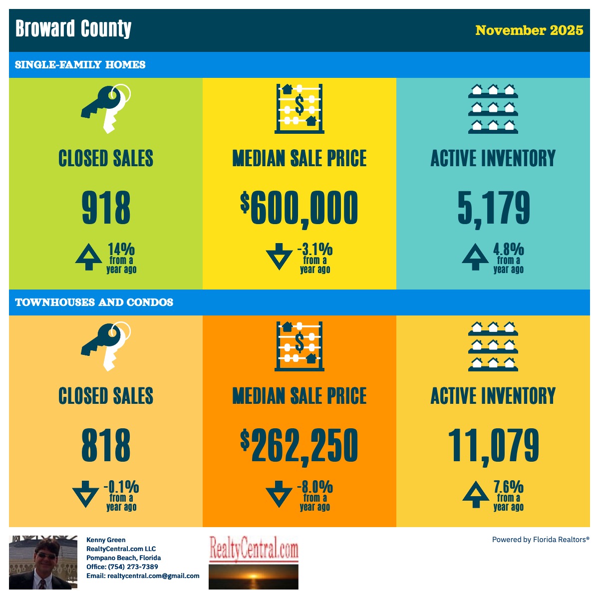 Real Estate Inventory for November 2025 in Broward County is up 4.8% year over year for Single Family and up 7.6% year over year for Townhouse/Condos with Median Sale Prices decreasing by 3.1% to $600,000 for Single Family and decreasing by 8% to $262,250 for Townhouse/Condo Sales for the same period.
