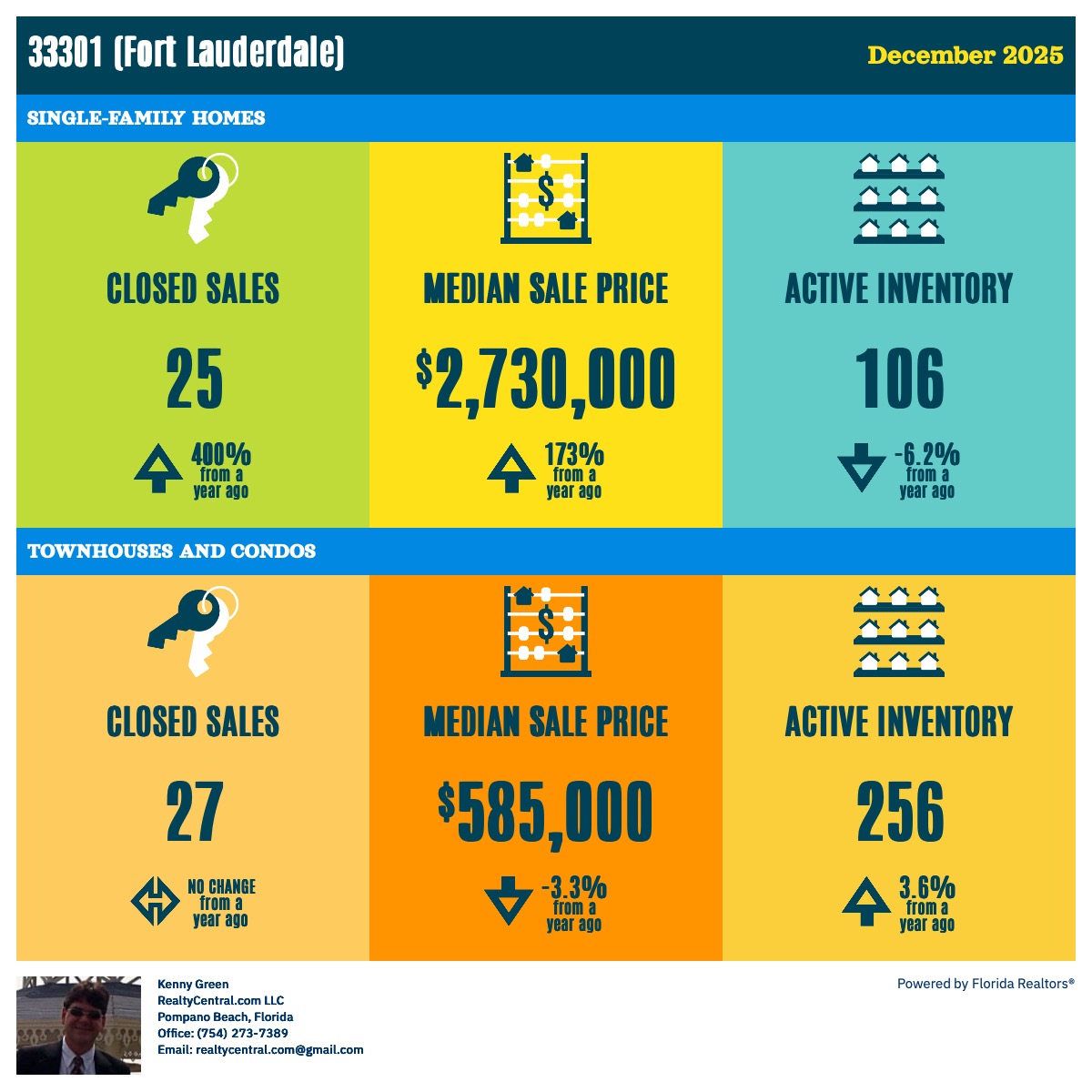 Real Estate Inventory for December 2025 in Zip Code 33301 is down 6.2% year over year for Single Family and up 3.6% year over year for Townhouse/Condos with Median Sale Prices increasing 173% to $2,730,000 for Single Family and decreasing by 3.3% to $585,000 for Townhouse/Condo Sales for the same period.