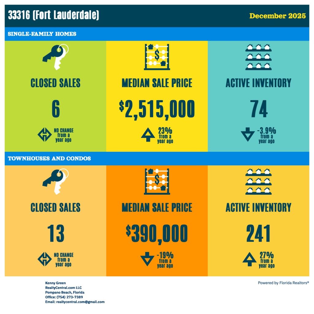 Real Estate Inventory for December 2025 in Zip Code 33316 is down 3.9% year over year for Single Family and up 27% year over year for Townhouse/Condos with Median Sale Prices increasing by 23% to $2,515,000 for Single Family and decreasing by 19% to $390,000 for Townhouse/Condo Sales for the same period.