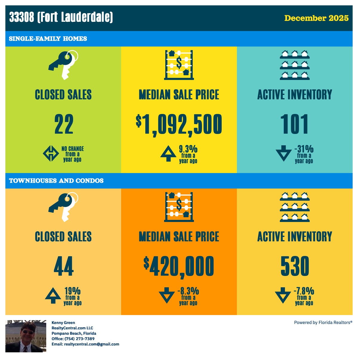 Real Estate Inventory for December 2025 in Zip Code 33308 is down 31% year over year for Single Family and down 7.8% year over year for Townhouse/Condos with Median Sale Prices increasing by 9.3% to $1,092,500 for Single Family and decreasing by 8.3% to $420,000 for Townhouse/Condo Sales for the same period.