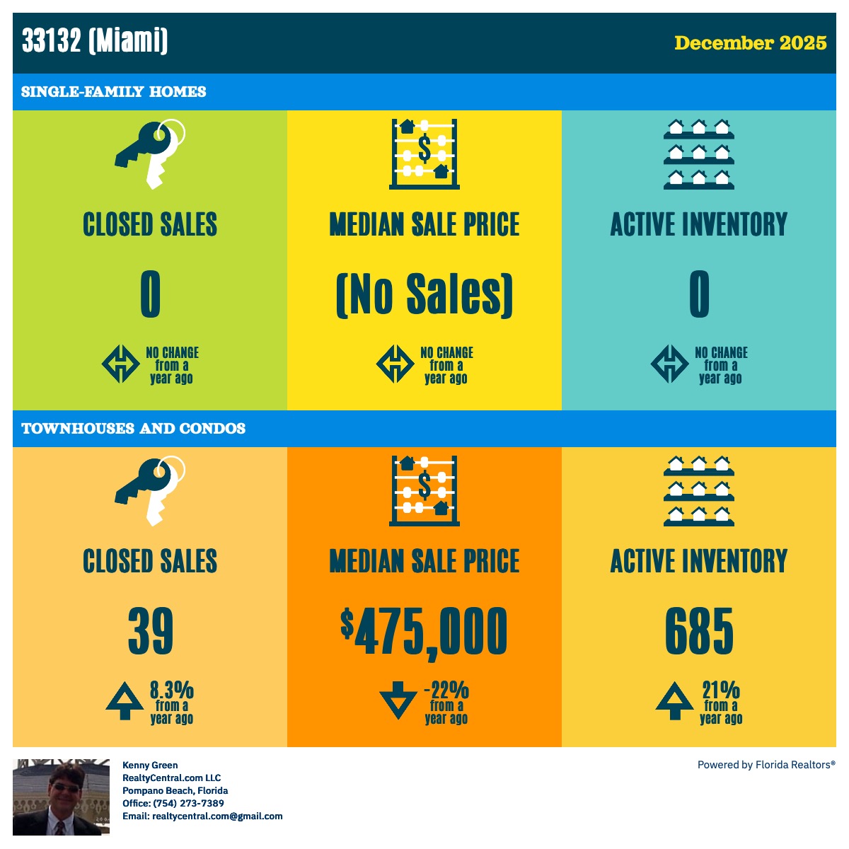 Real Estate Inventory for December 2025 in Zip Code 33132 at no change year over year for Single Family and up 21% year over year for Townhouse/Condos with Median Sale Prices at no change with no sales for Single Family and decreasing 22% with a Median Sale Price of $475,000 for Townhouse/Condo Sales for the same period.