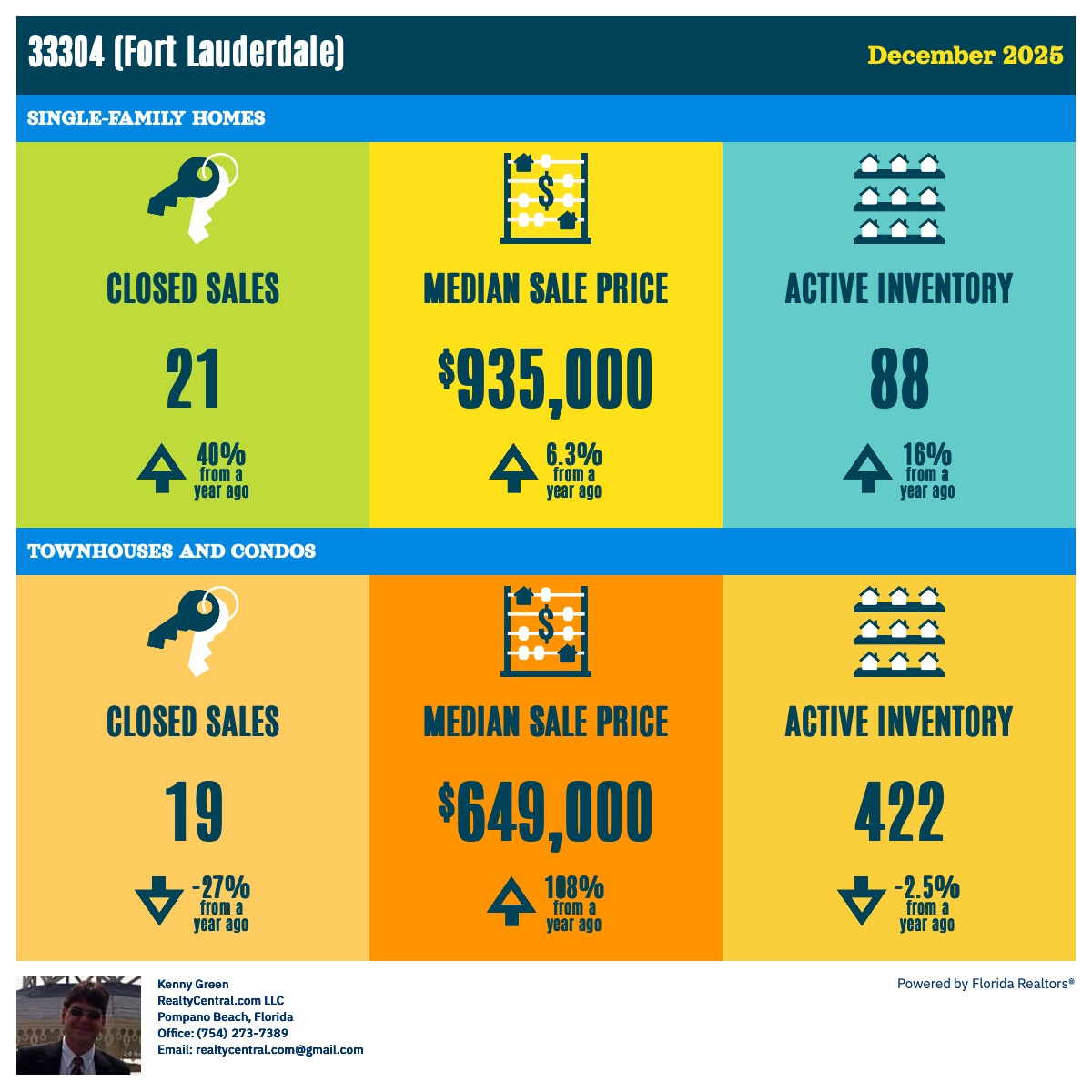 Real Estate Inventory for December 2025 in Zip Code 33304 is up 16% year over year for Single Family and down 2.5% year over year for Townhouse/Condos with Median Sale Prices increasing 6.3% to $935,000 for Single Family and increasing by 108% to $649,000 for Townhouse/Condo Sales for the same period.